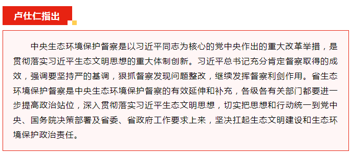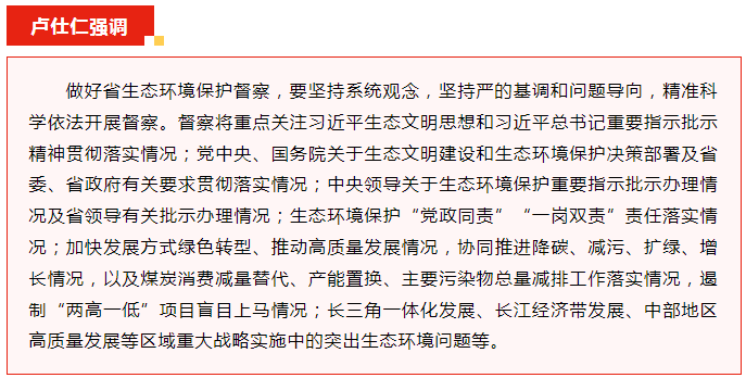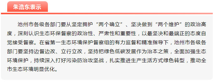 為深入貫徹習(xí)近平生態(tài)文明思想,認(rèn)真落實黨中央、國務(wù)院關(guān)于生態(tài)文明建設(shè)和生態(tài)環(huán)境保護(hù)的決策部署,全面貫徹全國、全省生態(tài)環(huán)境保護(hù)大會精神,經(jīng)省委、省政府批準(zhǔn),省第一生態(tài)環(huán)境保護(hù)督察組對池州市開展生態(tài)環(huán)境保護(hù)督察。5月30日,督察進(jìn)駐動員會在池州市召開,督察組組長盧仕仁、副組長顧群分別就做好督察工作作了講話,市委書記朱浩東進(jìn)行了進(jìn)駐動員,市委副書記、市長賀東主持會議。